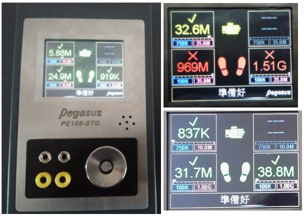 1.測試儀自帶顯示屏顯示阻值結(jié)果(紅色:未通過,綠色:PASS,黃色:近失效接近標(biāo)準(zhǔn)臨界值)