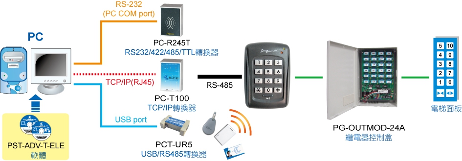 •經(jīng)由串行輸出(RS485或晶體管),搭配多點(diǎn)輸出繼電器盒(8F/24F/48F/64F/96F)可做電梯樓控管制。