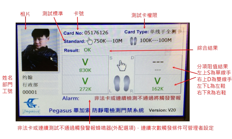 9. 七吋彩色顯示屏,測試時可顯示人員相片、姓名、部門、工號、卡號、測試卡種類、目前測試高低標(biāo)、測試結(jié)果手鞋阻值結(jié)果、綜合結(jié)果(OK才可通過,其余顯示錯誤原因不可通過)。